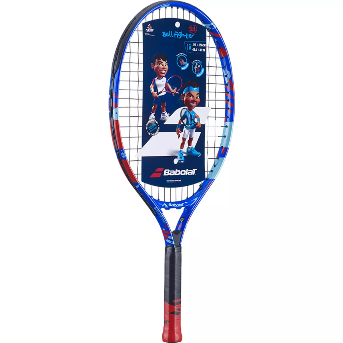 Het Ballfighter 21 racket is lichter, makkelijker te hanteren en flexibeler. Uw kampioen in de dop zal gek zijn op het speelse kleurrijke design van dit racket! Om het aanleren van tennis te vergemakkelijken, hebben we pedagogische tools direct op het racket geïntegreerd om kinderen te helpen met de basis van het tennisspel. Het is geen toeval dat het Ballfighter racket aanbevolen wordt door 6000 trainers in de wereld. Het racket Ballfighter 21 is geschikt voor spelers tussen de 110-125 cm.